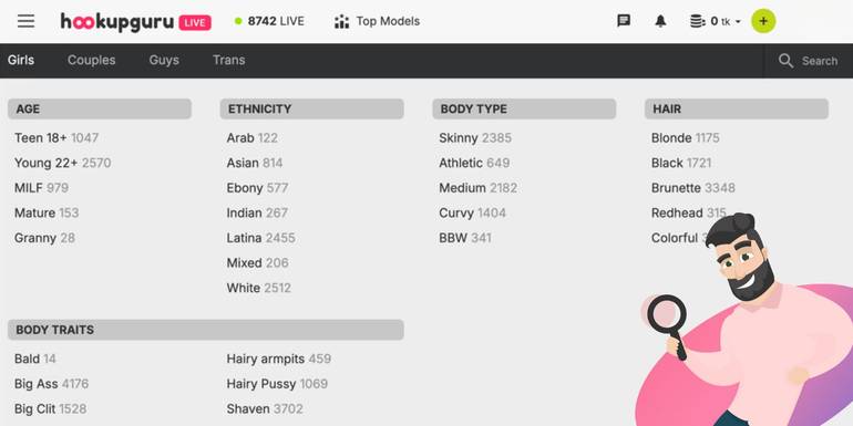 There is a regular, even corny, list of HookupGuruLive models. Navigate to the upper bar and choose what model you wish to see. After that, you can play with the categories and filters listed on the leftmost bar.