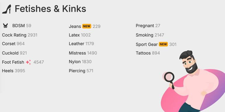 Filters can be used for the categories. You can literally mix all ethnicities, ages, and body types with fetishes to create the most mind-blowing mix.