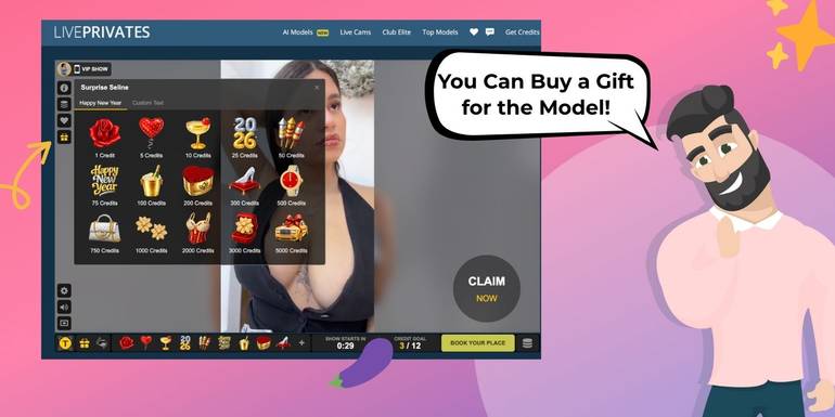 Untypically for webcam sites, Liveprivates com offers a special feature of buying gifts. You just need to click on the gift icon and surprise a model. You can give gifts to anyone, and they can then see who they got them from. In such a way, they'll most likely spend more and more time with you.