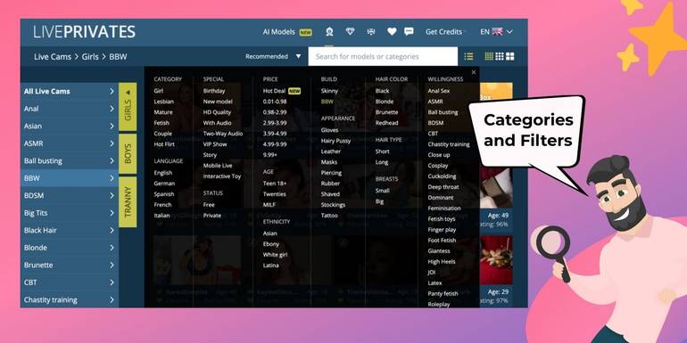 Fetishes are mixed with categories. However, you can try the tag search if you're too lazy to scroll and find your favorite fetish in the list. You can use the magnifier in the top right corner and input the desired tag. LivePrivates com gives you all the basic fetishes, nothing you canât find on PornHub: from our favorite BDSM to the very BBW facesitting.