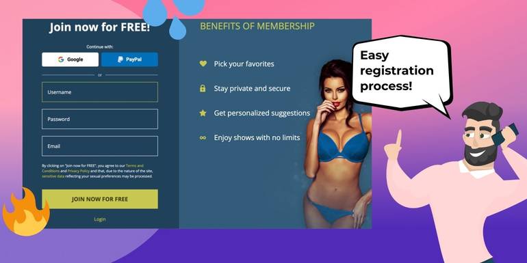 Sometimes even the most agreeable adult cam sites can scare off by the complicated system of sign up. Itâs not the case. You'll need to fill out a little form comprising your username, password, and email. After that, you'll be asked to give your credit card details, and thatâs all.