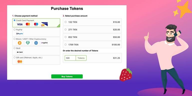You can purchase tokens once you've created an account. You can redeem tokens at different sections of the site for private shows and group sessions. Use tokens to send tips and purchase videos and photos in a model's gallery. You even have the chance to win tokens back through regular promotions.